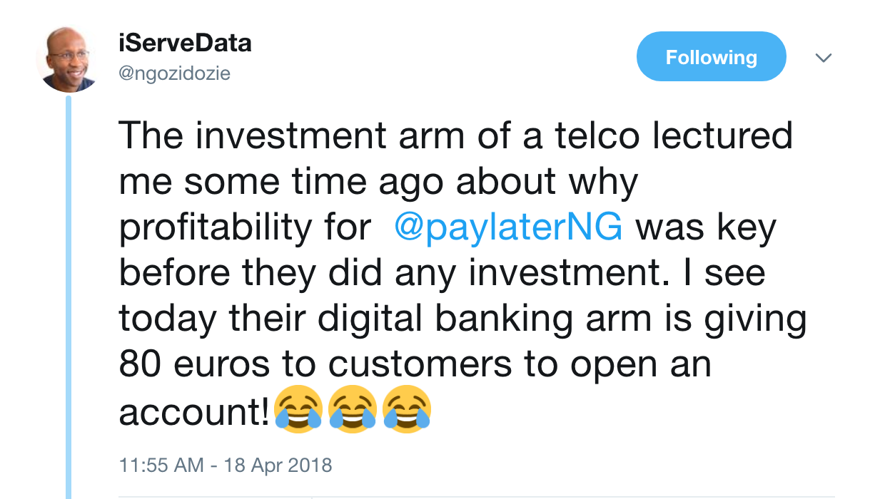 If Nigeria wants to create really really big (as in Billionaire Boys big), we need a scenario where investors are ready and willing to fund those losses. Because to grow big, I haven’t seen many examples of in consumer internet without boat loads of cash.
